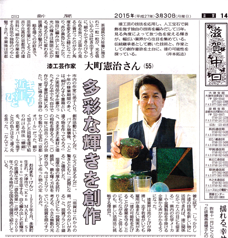 3月30日付中日新聞、「キラリ 近江びと」に活動を掲載していただきました。